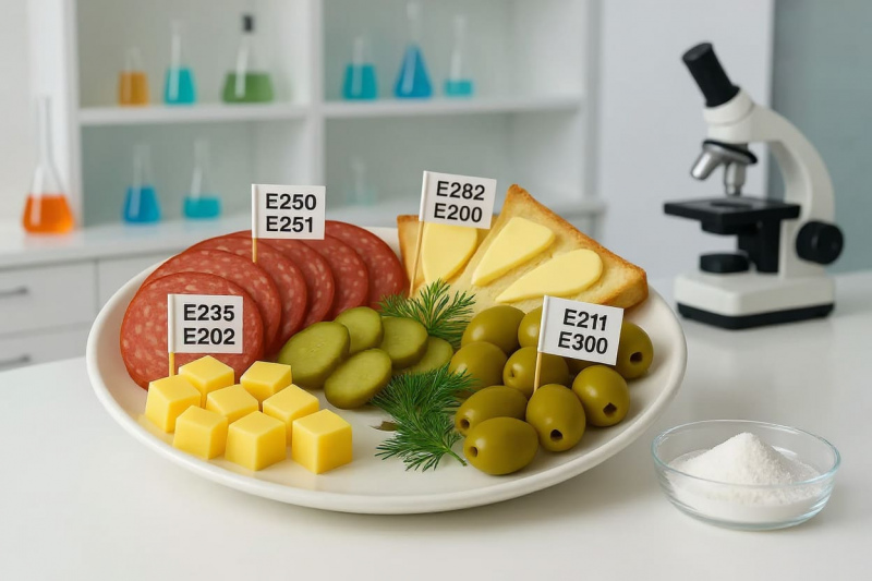 - Продление срока годности обеспечивается консервантами, которые подавляют рост болезнетворных микроорганизмов и предотвращают порчу продуктов. Это особенно важно для товаров, которые транспортируются на большие расстояния или долго хранятся на полках магазинов.