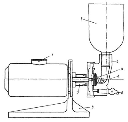 1 - электромотор УЛ-62 №-0,270 квт, 8000 об/мин; 2 - воронка; 3 - корпус; 4 - турбинка (смеситель); 5 - шнек; 6 - кран; 7 - гайка; 8 - стойка