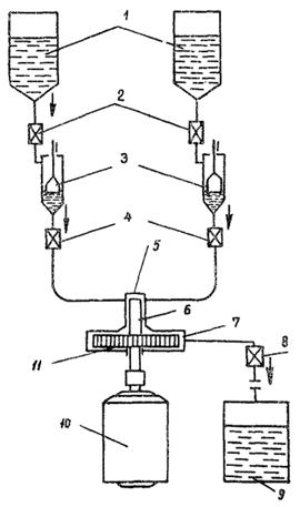 1 - загрузочный бак; 2 - вентиль; 3 - мерная емкость с поплавковым указателем уровня; 4 - вентиль; 5 - приемная камера; 6 - шнек; 7 - крышка; 8 - вентиль; 9 - приемный бак; 10 - электродвигатель УЛ-072 - 8000 об/мин; 11 - диск